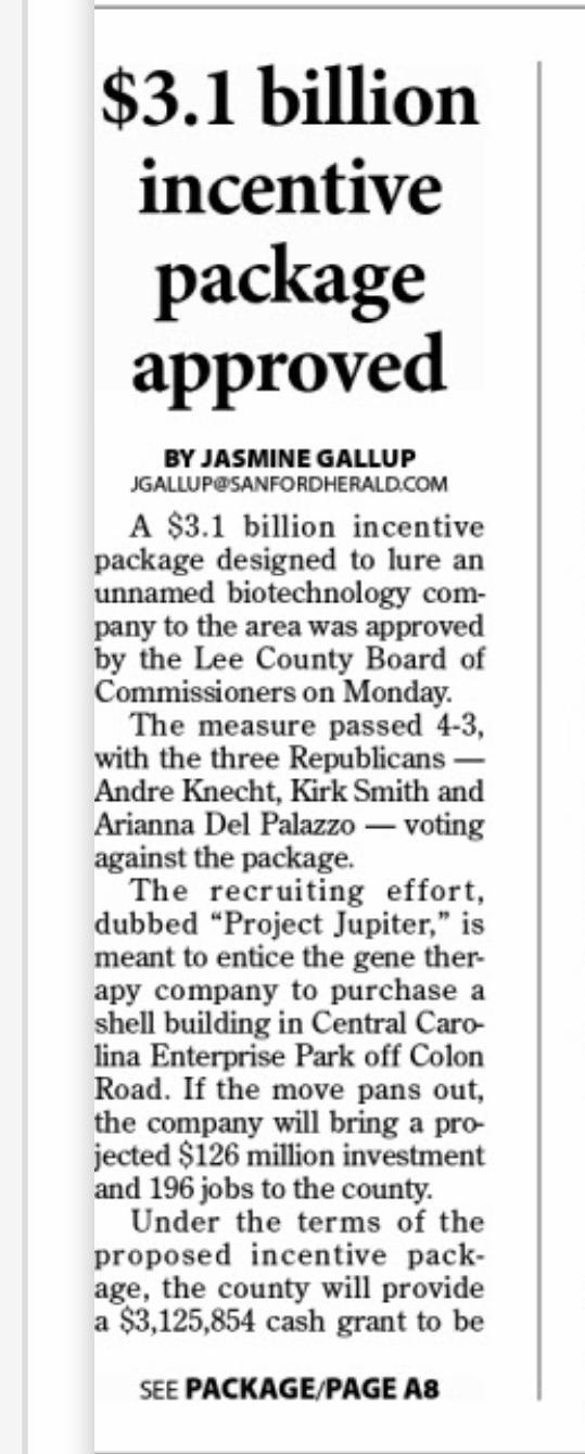 Like at the county’s meeting, there was actually little discussion of the project itself before the vote. Afterwards, though, CEO Michael Smith of the Sanford Area Growth Alliance said predictions of the life science industry potentially “clustering” in Lee County could be coming to fruition if the company accepts the deal.