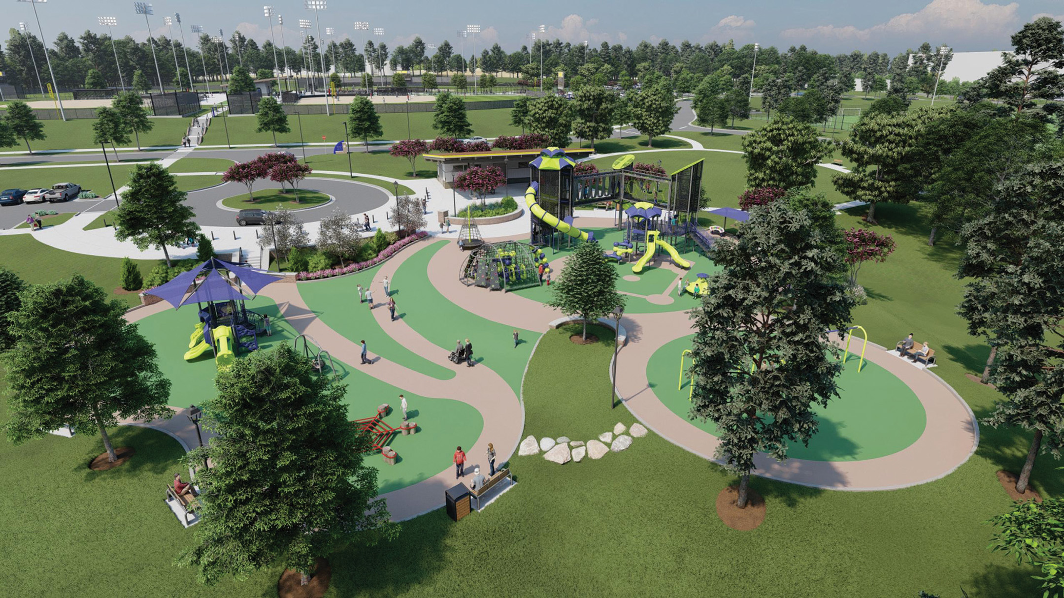 Tall lights surround the fields throughout, and moving south past the ball fields are multiple rectangular pitches that could be used for soccer, football, and even lacrosse. There are roughly 900 parking spaces to accommodate the hundreds of families expected to visit the facility. In a back corner sits an area that Keel calls the “$1 million playground.”