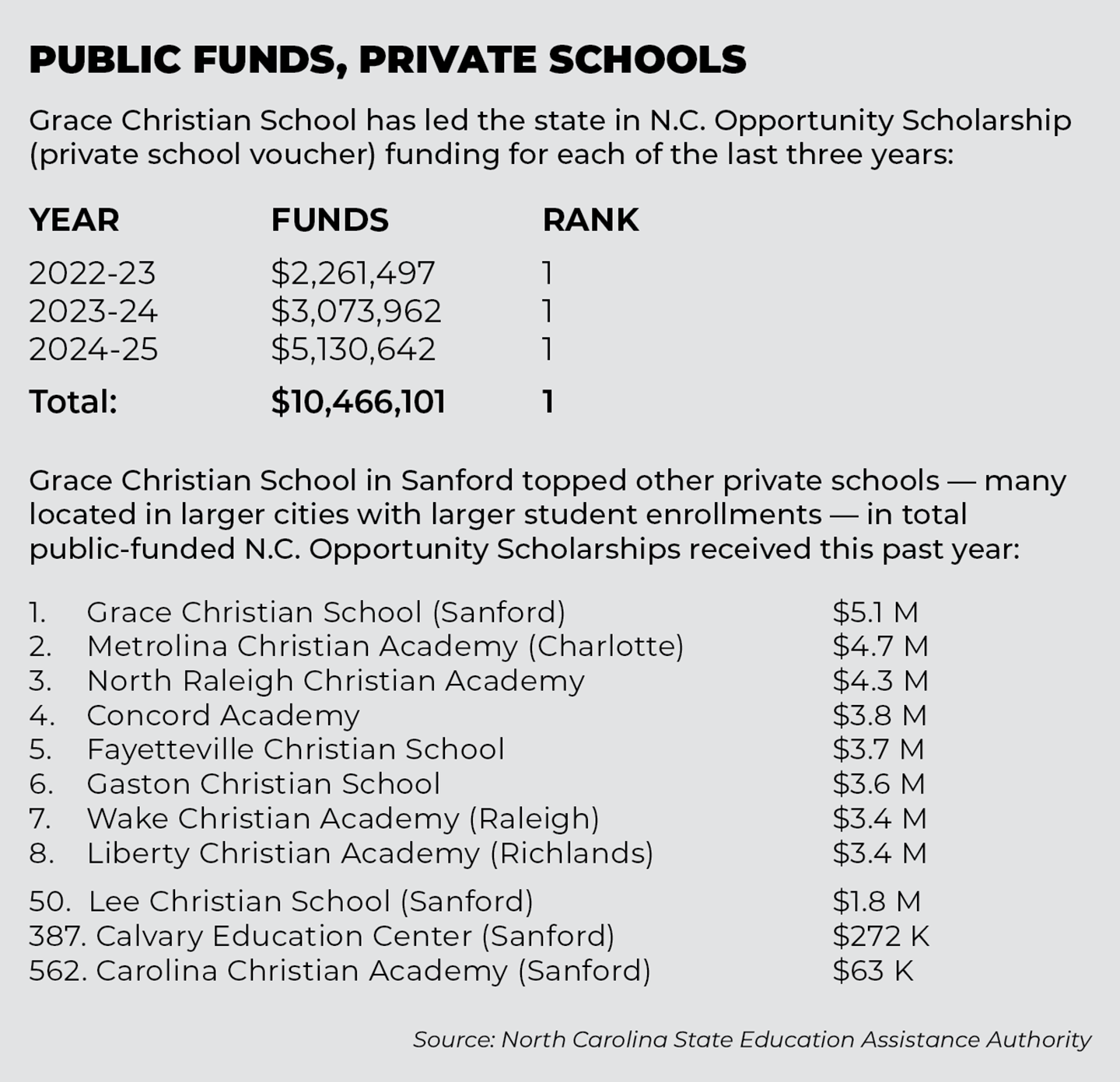 No school in the state has benefited more from the North Carolina Opportunity Scholarship program than Grace Christian School. According to data shared by the North Carolina State Education Assistance Authority — which oversees the scholarship — Grace Christian has led all 600-plus private schools in the state in public funding each of the last three years.